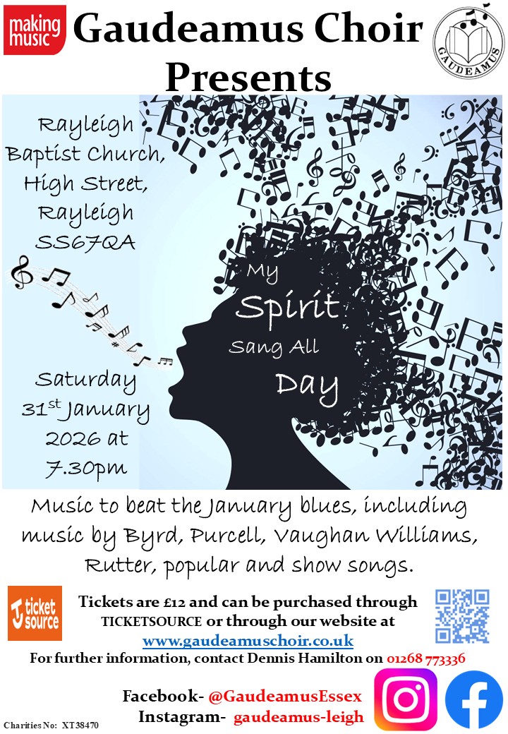The following concert, My Spirit Sang All Day, will be on Saturday 31st January 2026 at Rayleigh Baptist Church.